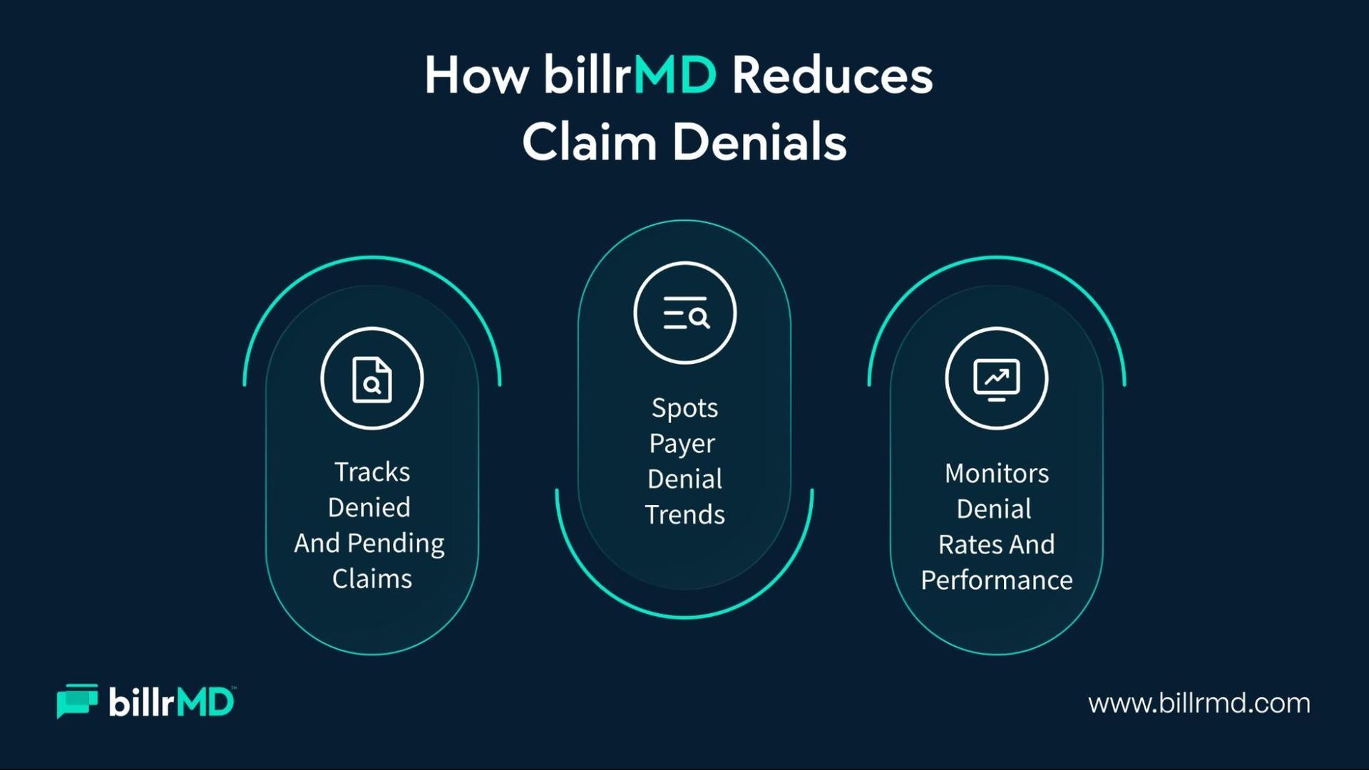 billrMD categorizes denials by type, including eligibility issues, coding errors, missing documentation, and authorization problems. This breakdown makes it easier for teams to see exactly where issues occur in the billing process.